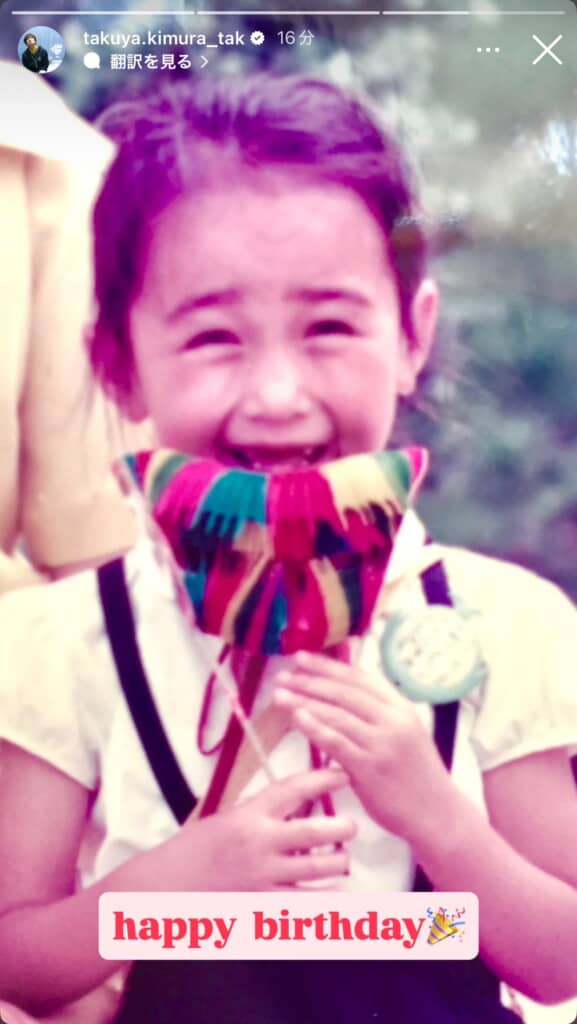 木村さんが「happy birthday」とクラッカーの絵文字を添えて投稿したのは、幼いころの工藤さんが写った写真。工藤さんはあどけない表情を浮かべ、目を細めています。この写真のセレクト、木村さんの愛が伝わってくる……!