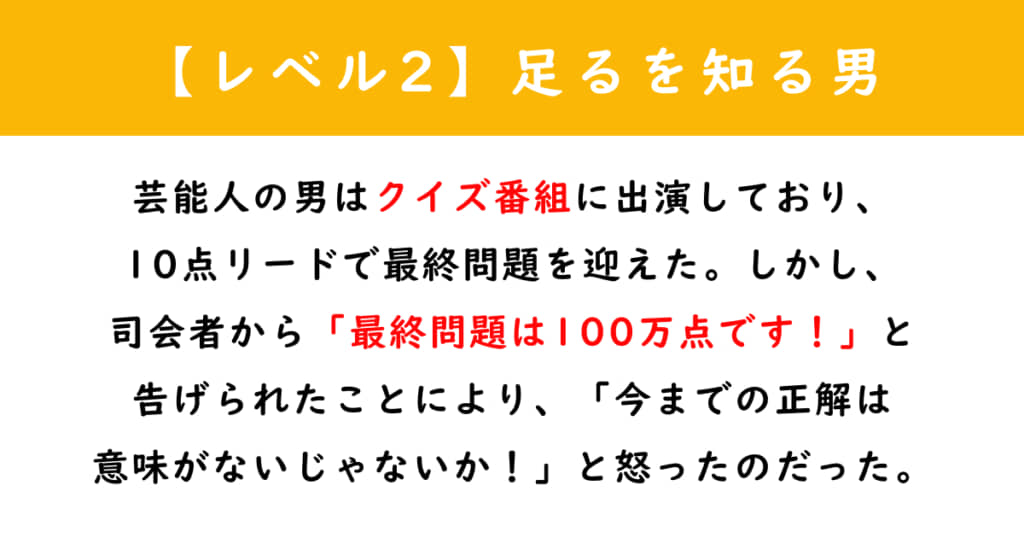 【解答】芸能人の男はクイズ番組に出演しており、10点リードで最終問題を迎えた。しかし、司会者から「最終問題は100万点です!」と告げられたことにより、「今までの正解は意味がないじゃないか!」と怒ったのだった。