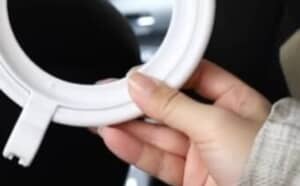 輪の部分にビニール袋を通した後、リングを閉じると簡易的なゴミ箱へ早変わり。帽子ハンガーのフック部分を座席のヘッドのポールに引っ掛けて使います。ゴミ袋は縦33センチ、横22センチのものがちょうど良かったとのこと。