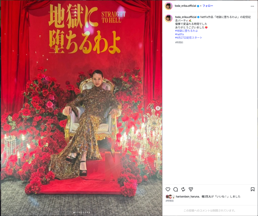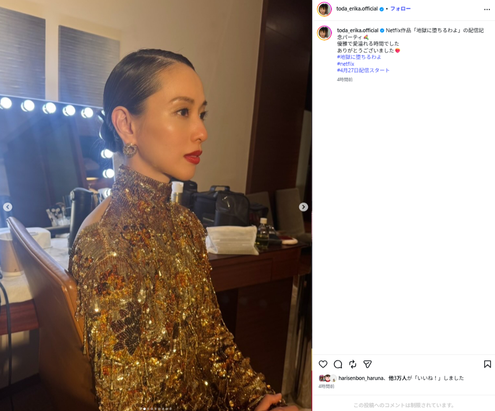 今回の投稿は、4月27日から配信されるNetflixシリーズ「地獄に堕ちるわよ」のイベントに出席した際のもの。同作で主演を努めた戸田さんは「優雅で愛溢れる時間でした」と振り返り、感謝の言葉もつづっています。
