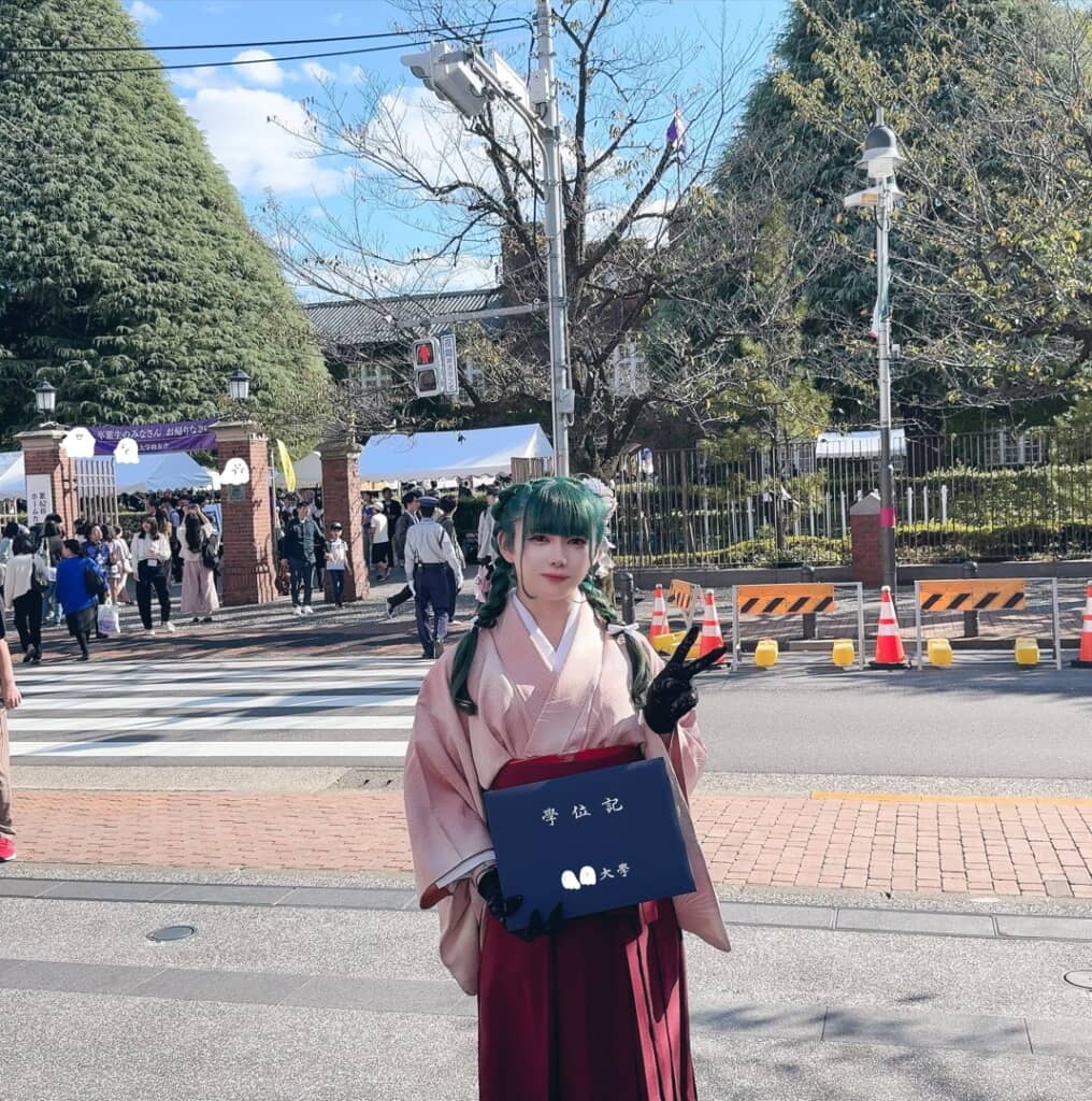 )卒業式の窓賀さん。えんじ色の袴と緑の髪が印象的です