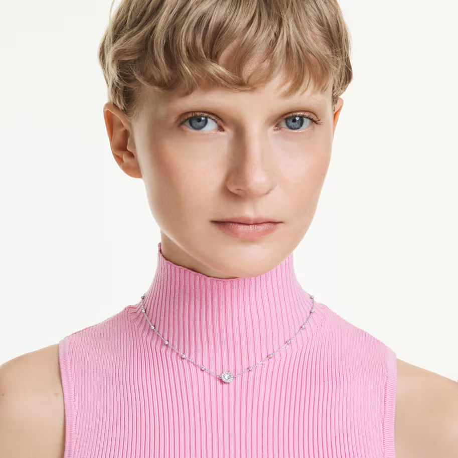 約0.9×1.1センチのモチーフは裏返すことで異なる表情を楽しめるデザイン。ラウンドカット・クリスタルのきらめきが角度によって印象を変え、ひとつで2通りの雰囲気を演出します。単体で上品にまとめるのはもちろん、他のネックレスとのレイヤードにも取り入れやすい一本です。