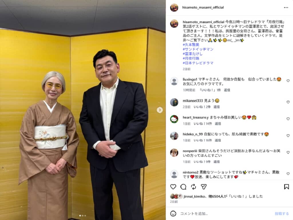 久本さんいわく、同日放送のテレビドラマ「月夜行路」(日本テレビ系)にて、富澤さんとゲスト出演を果たすとのこと。俳優の麻生久美子さんと波瑠さんがW主演する同作で、久本さんは呉服屋の女将“佐藤頼子”、富澤さんは骨董品の主人“佐藤剛”をそれぞれ演じるそうです。