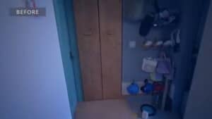 まず手を付けるのがアキさんが「ラスボス」と呼ぶ巨大な重量級収納。玄関廊下の奥にある、床から天井までの高さの大きな縦引き出し式の木製収納棚です。収納不足を解消するためにモヘジさんが自作したもので、大量に収納できる反面、重くて使いづらかったそうです。