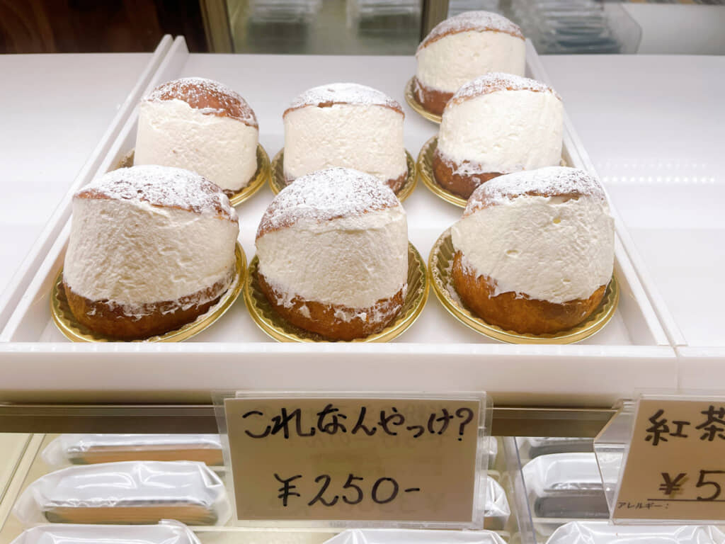 丸いパンに大量のクリームを挟んだ特徴的な見た目をしており、値札には、「これなんやっけ?」と書かれています。2020年ごろからSNSなどで大きな話題となった「マリトッツォ」であるものの、ブームからはや数年。存在感が薄れてきた現状を反映し、シュールな商品名にしてしまったみたいです。