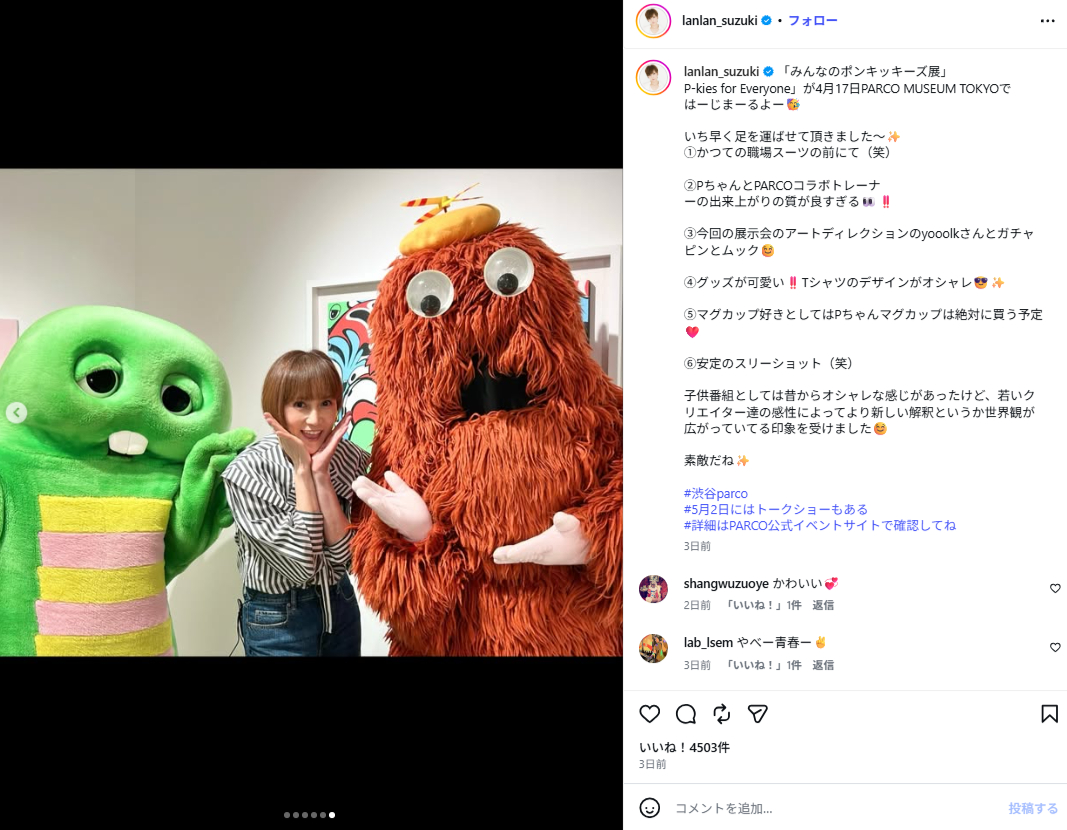 俳優や歌手として活躍する鈴木蘭々さんが4月17日にInstagramを更新。かつて出演していたフジテレビ系の子ども向け番組「ポンキッキーズ」の展示イベントを訪れ、その“現在の姿”が「お美しい」「若さの秘訣は何ですか?」と反響を呼んでいます。