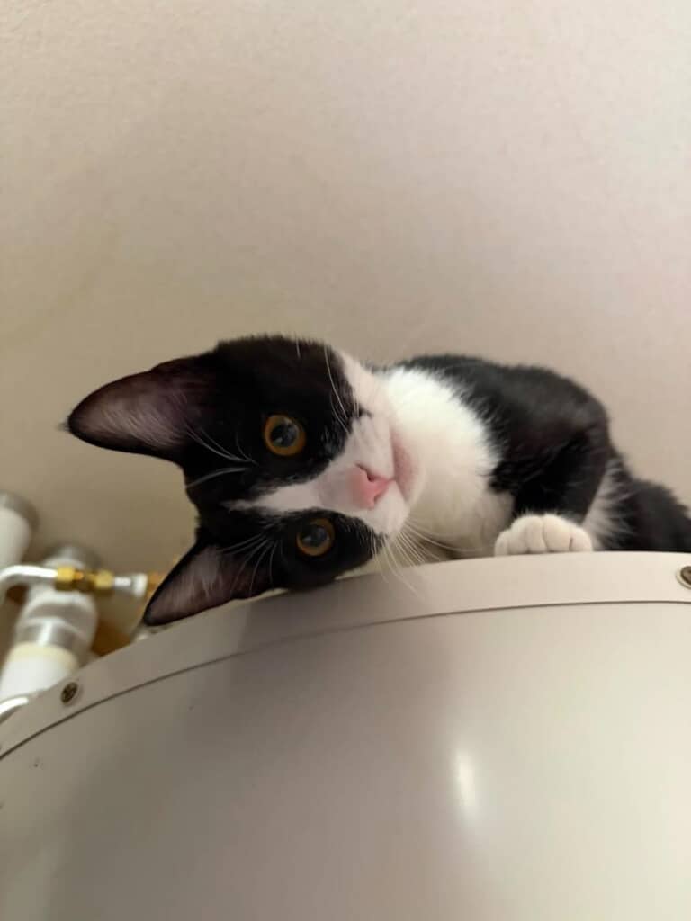 投稿者は、牛舎生まれの保護猫「ミル」ちゃん「モカ」ちゃんと暮らしている飼い主(@milumoca.1031)さん。ある日、きれいなハチワレがチャームポイントのミルちゃんが高い所に登ってしまいました。