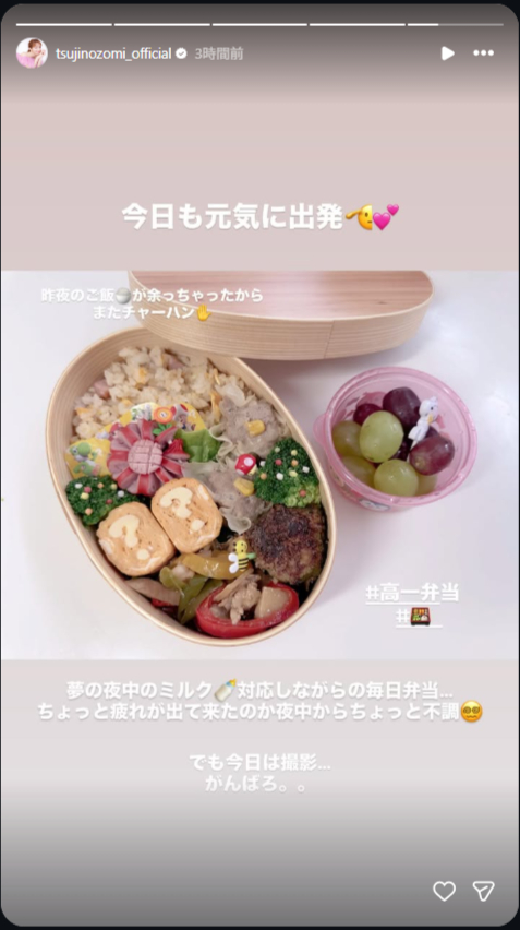 さらに辻さんは、2025年に誕生した次女・夢空(ゆめあ)ちゃんの夜間のミルク対応などもこなしながら、毎朝早起きでお弁当作りに奮闘。この日は「疲れが出て来たのか夜中からちょっと不調」と体調の異変も明かしています。