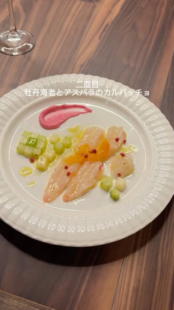 2皿目は、牡丹エビとアスパラのカルパッチョ。エビの上には、オレンジとアクセントのピンクペッパーが散らされており、その隣にはサイコロ状にカットされたアスパラガスが並びます。ソースのあしらい方も繊細で、まるでプロが作ったかのような仕上がりです。