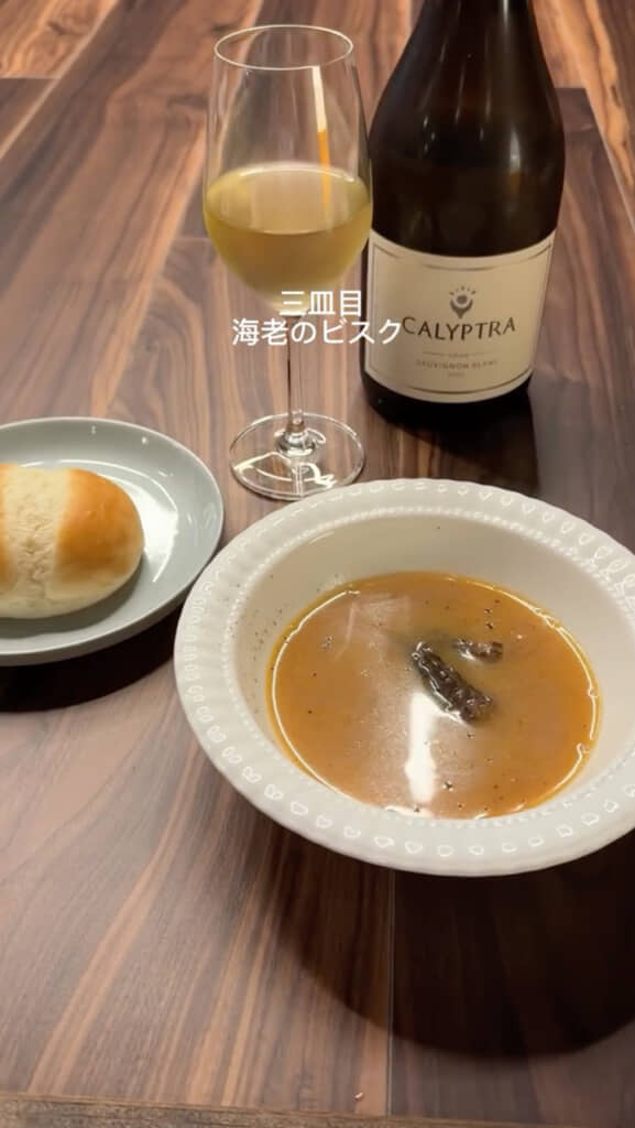 しかし、夫が用意していたのはこれだけではありませんでした。なんと早朝から豊洲へ足を運び、ぽんちゃんさんの大好物であるエビを数種類仕入れていたとのこと。さらに、泡・白・赤のペアリングまで用意。そのままキッチンに立ち、フレンチのフルコースを振る舞ったそうです。