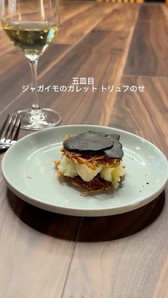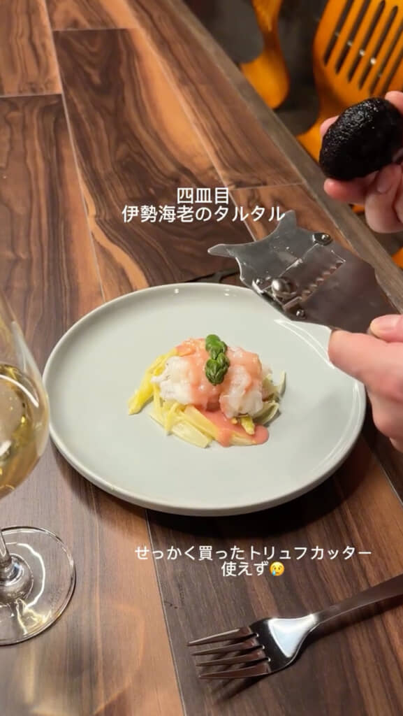 モリーユ茸入りの海老のビスクで体を温めた後、4皿目に伊勢エビのタルタル、5皿目にジャガイモのガレットが続きます。トリュフも用意されていましたが、専用のカッターがうまく使えず、タルタルにかけるのは断念。ただ、ガレットにはスライサーで添えることができました。