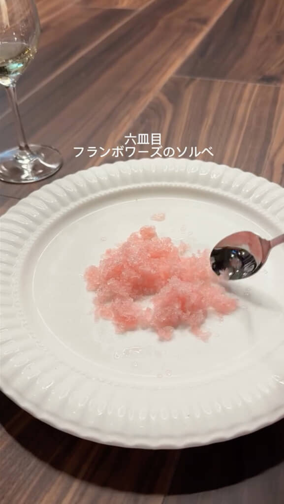 6皿目のフランボワーズのソルベでお口直しをしたら、いよいよメインの牛フィレ肉のステーキが登場。しっとりと焼き上げられたお肉に、エビの出汁を使用したソースがかかっており、これまでのコースの流れを感じさせる一皿に仕上がっています。
