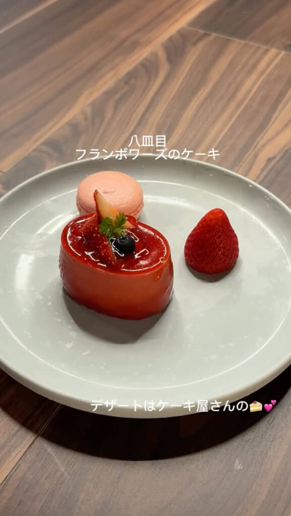 そしてラストを飾るのは、フランボワーズのケーキ。こちらは、ケーキ屋さんで購入したものだそうですが、お皿に美しく盛り付けられ、かわいらしいマカロンとイチゴが添えられています。