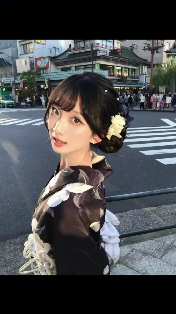 続くシーンでは、成長した投稿者さんの姿が映し出されます。まず印象的なのは、街中の横断歩道で振り返るようにこちらを見つめるカットです。背景には人通りの多い街並みや建物が広がり、夕方から夜にかけての時間帯であることがうかがえます。投稿者さんは和装に身を包み、髪には花飾りをあしらっています。落ち着いた色味の着物と柔らかな表情が相まって、穏やかで上品な雰囲気が漂っていますね。