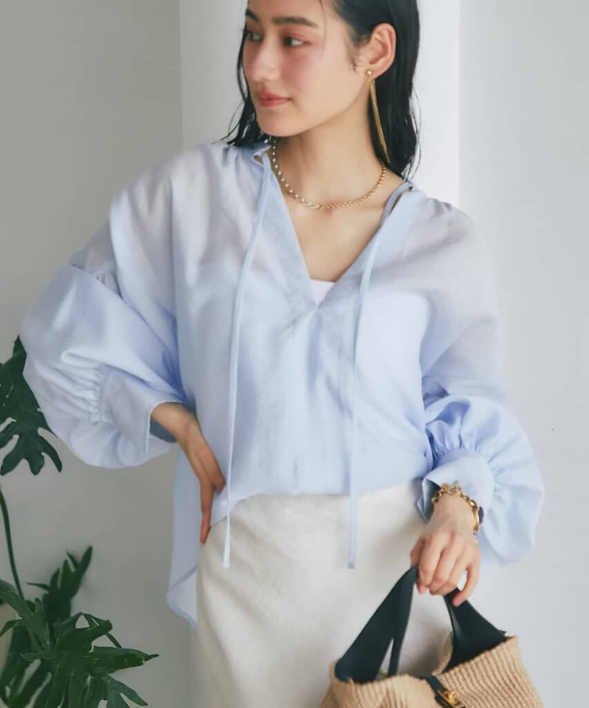 2枚目はふんわりシルエットのブラウスです。これもボトムスを間違えると一気に野暮ったい印象に。チュール素材のティアードスカートを合わせていますが、余計に体が大きく見えてしまうため、ボトムスは細身のIラインスカートに替えて首元を開けるとすっきりするとのことです。体形まで違って見えるなんてすごい。