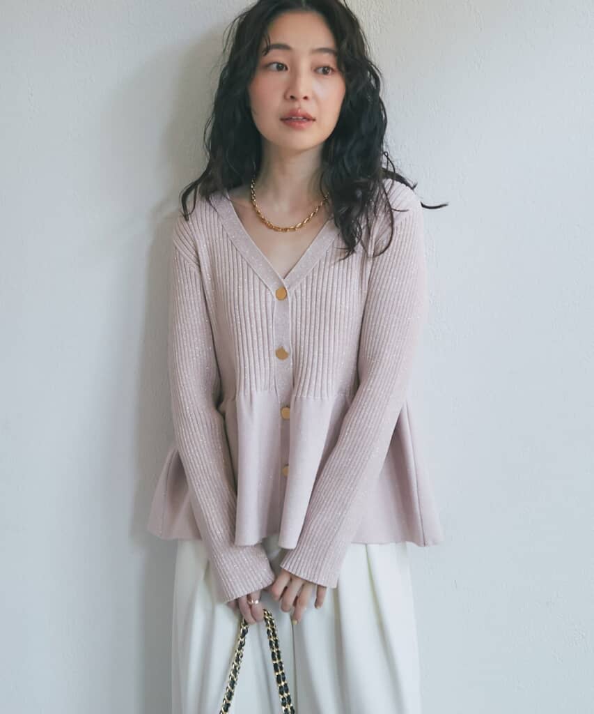 risaさんは160センチの骨格ストレートです。まずは、胸の位置に切り替えがあり裾が広がったペプラムカーディガンの着こなし方です。Vネックの中に濃い色のインナーとストンとしたストレートパンツを合わせてしまうと、ドカンとしたシルエットになって着膨れしてしまいます。一方、Vネックはインナーが見えないようにすっきりさせ、細身のパンツを合わせるとスッキリとした印象に見えるそうです。risaさんは「首元はスッキリVネックで縦ラインを作ると更に◎」と伝えています。なるほど……!