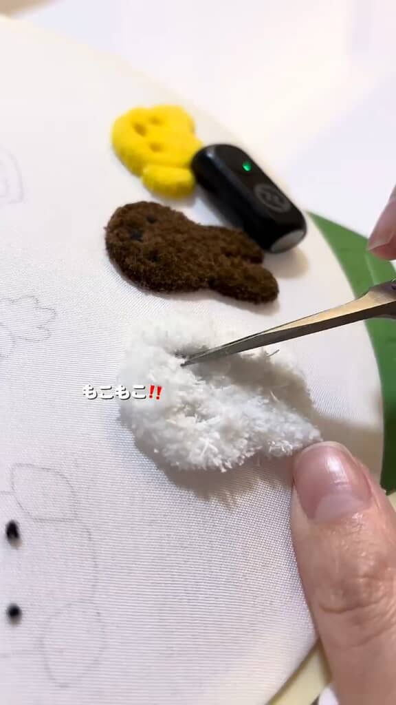 刺しゅうの題材は、ディック・ブルーナの絵本に登場する仲間たち。何度も針を刺し、飛び出した毛を切りそろえ……と細かい作業を繰り返すうちに、ミッフィーやスナッフィーなどさまざまなキャラクターができあがります。なお、作業中は「糸がみっちり!! もこもこ!! ぴょこぴょこ!!」など、エネルギッシュな奇声が出っぱなし。