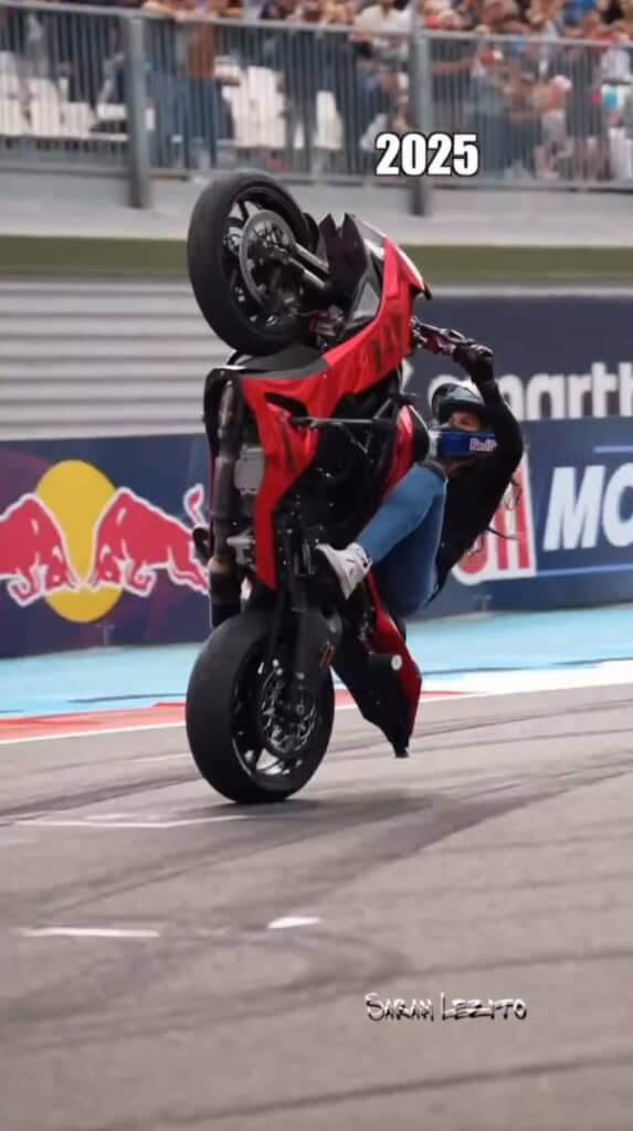 そして時は流れて、2025年の映像に移り変わります。サラさんは2017年には転倒したウィリー走行で、滑らかにコースを走っていました。近くでサラさんを捉えた映像を見ると、バイクは地面に対してほぼ垂直になるほどに高く持ち上げられています。サラさんは力強く軽やかに走り、観客の歓声に答えました。