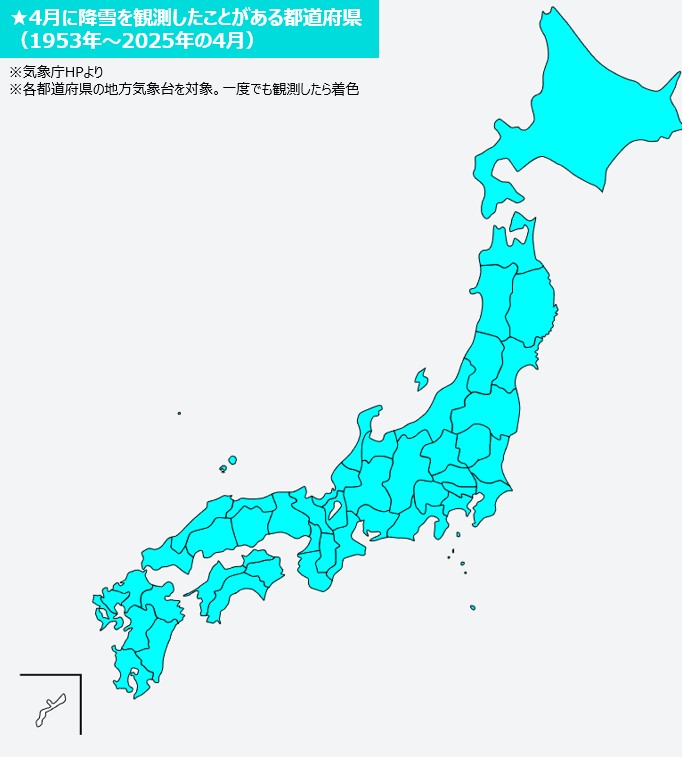 4月以降に雪が観測された都道府県は、なんと沖縄県をのぞく46都道府県! 北海道や東北などの雪国では、山沿いを中心に雪が降るのは納得できますが、南国と言われる鹿児島や宮崎、高知、また東京、名古屋、大阪など太平洋側の都市部でも観測されています。意外ですね!
