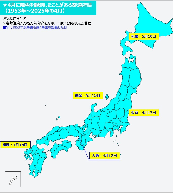 いかかだったでしょうか。今回は「4月以降に降雪を記録した都道府県」を紹介しました。次回もぜひお楽しみに!