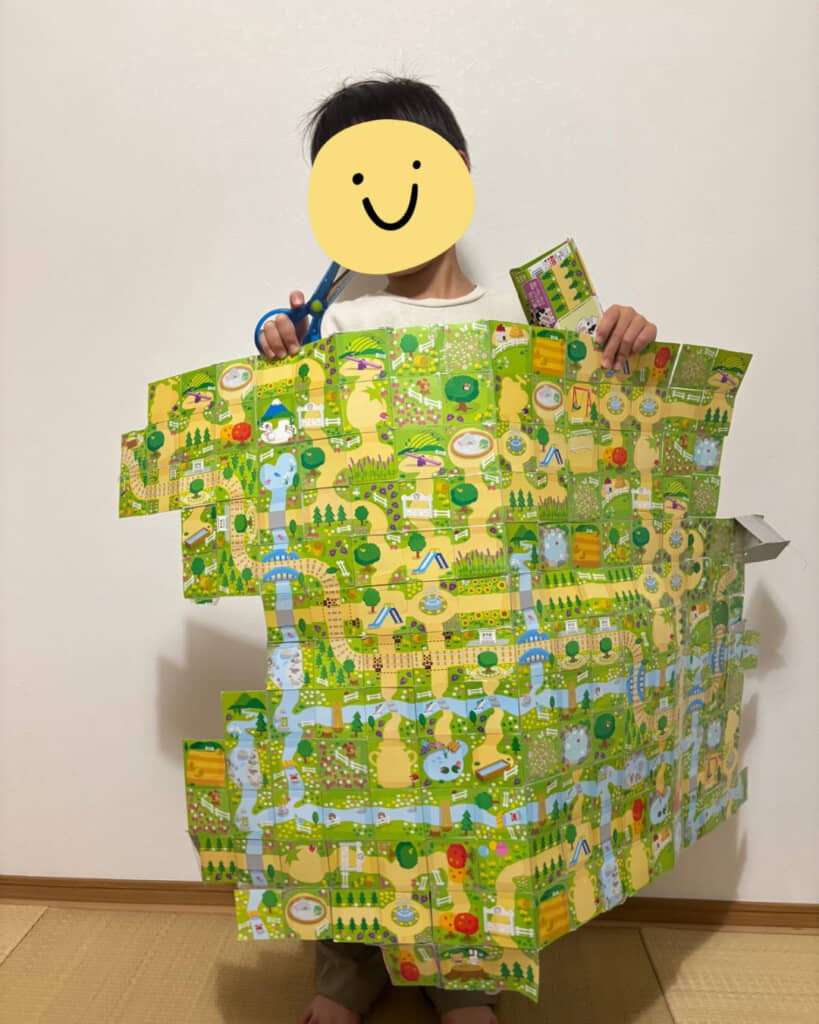 使っているのは、雪印メグミルク「牧場の朝」というヨーグルト(3個セット)の底に敷いてある紙のパッケージ。「つくってあそぼ!」をテーマに、はさみでカットして切り紙遊びができるようになっています。牛やブタなどの動物の絵柄や自然あふれる景色、木々や歩道など全部で45種類も用意されており、つなげて自分だけの町を作れる仕様です。