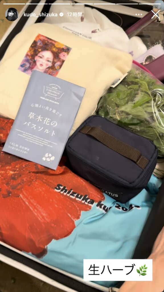 そんなコンサートの前日、工藤さんが投稿したのは滞在中のホテル内での様子です。工藤さんがスーツケースを開けると、荷物の隙間には密封保存容器に入れられた“謎の野草のようなもの”が。その正体は、ハーブティーで知られる“生ハーブ”。工藤さんは「これを冷蔵庫に入れる。朝摘み立てなのよ」と上機嫌に話します。
