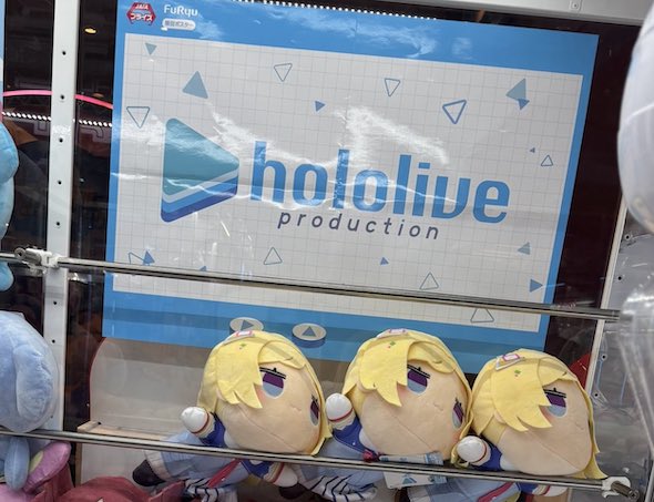 筐体内の奥には「ホロライブ」のロゴが掲出され、同グループの1期生としてデビューしたアキ・ローゼンタールさんのぬいぐるみが並べられているのですが、その下に置かれているのは「重音テト」のぬいぐるみ! まるでホロライブの一員のような扱いです。