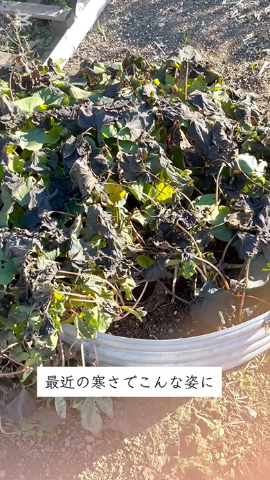 言われるまま素直にサツマイモを土に植え、夏場に多少水やりをしたものの、その後はほとんど放置。それから季節は冬になりました。サツマイモの様子を見に行くと、少し前まで青々としていた葉っぱが寒さでぐったりとしているではありませんか!