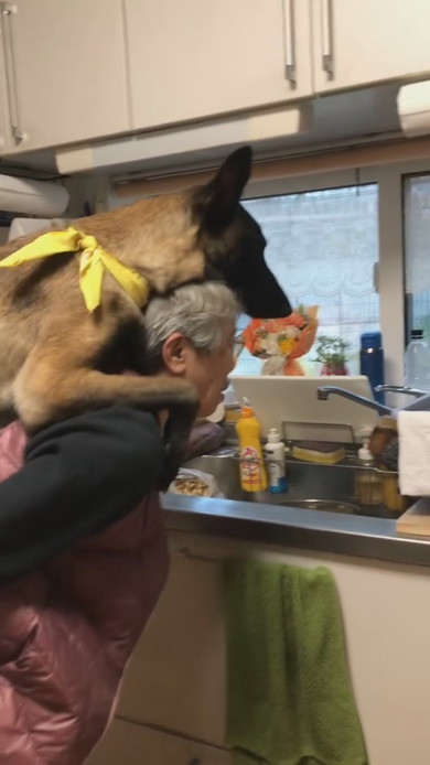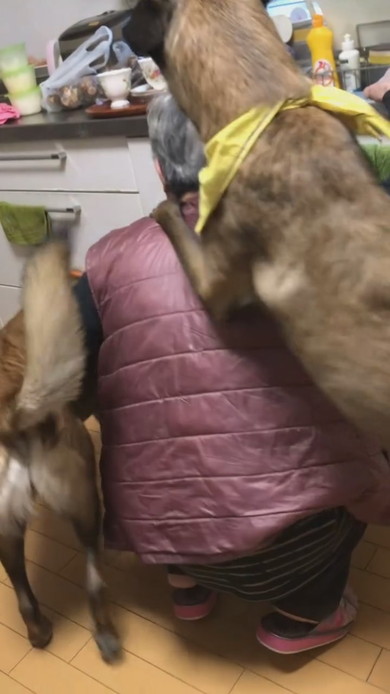 おばあちゃんがキッチンに立っていると、いそいそと寄ってきたウルルちゃんとシオンちゃん。一体どうするのかと見守っていると、なんと、ウルルちゃんがおばあちゃんの肩に前足をかけておんぶをねだり始めました! おばあちゃんはいつものこととばかりに、すっと手を伸ばしてお尻を支えて持ち上げます。
