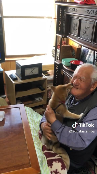 アディちゃんを膝に乗せるおじいちゃん。おとなしく抱っされているかと思いきや、アディちゃんはおじいちゃんの顔をペロペロなめ始めました。おじいちゃんが優しく手で押さえても何のそのといった様子でなめ続けます。あまりの激しさに、犬好きのおじいちゃんもたじたじです。