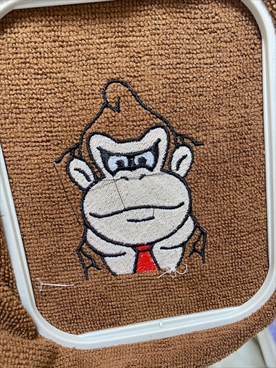用意したのは、100円ショップ「ダイソー」の商品「ふんわりマイクロファイバーフェイスタオル(ダークカラー)」「コットン巾着袋(バナナ)」。まずは家庭用の刺しゅうミシンを使って、タオルにドンキーコングの柄を刺しゅうします。