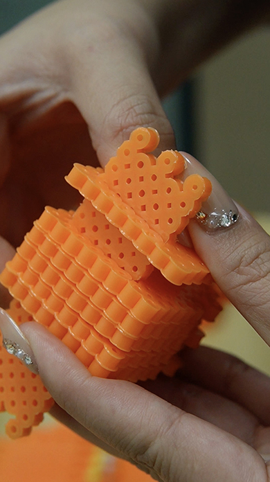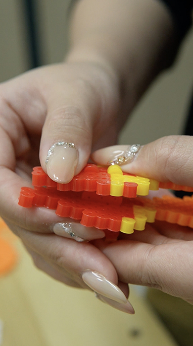 しかしこの動画では、オレンジ色の“アイロンビーズの板”を大量に作って組み合わせ、立体的な作品を作っていきます。各パーツは複雑な形をしており、完成形を想定してパーツを作るだけでもとてつもない作業量になりそうです。