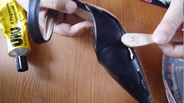 ミュールタイプの黒いレザーの靴ははき古されて中敷きも薄くなり、つま先部分はレザーがはがれかけています。全体的にレザーも艶がなく古びた感じです。この靴の側面に細く瞬間接着剤を付けていきます。