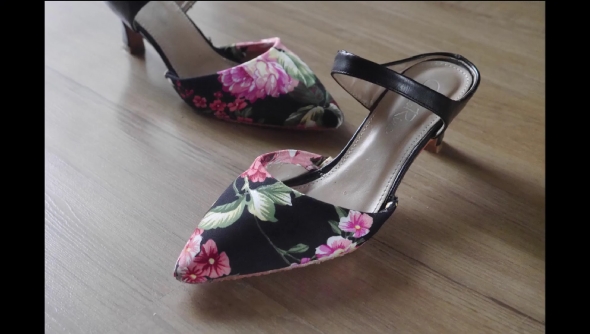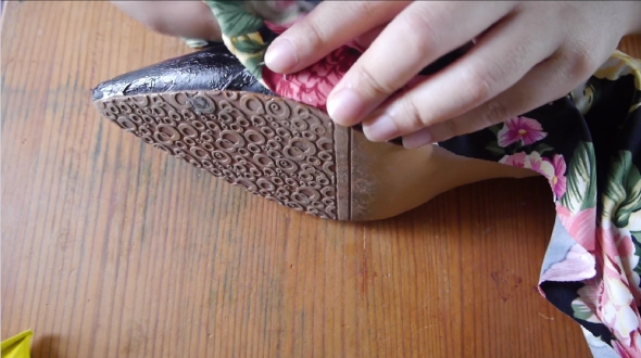 余った生地をカットし、レザーを包むように貼り付け、靴底部分に生地が残らないように靴の側面をロータリーカッターでカットしたら出来上がり。アンクルのベルトはそのまま黒のレザーを生かし、足の爪先部分だけ黒地に花柄の布地で包み、まるで新品同様のステキな靴に生まれ変わりました。とってもおしゃれです!