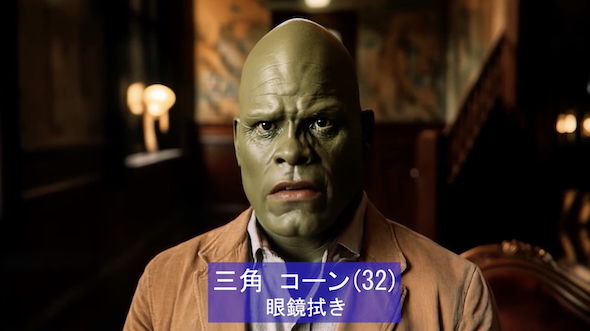 緑色の顔の人物に「犯人はあなたです。三角コーナーさん」と迫るも、その人は「私、三角コーンです」と返答。肩書は「眼鏡拭き」となっています。どういうことなんだ……。