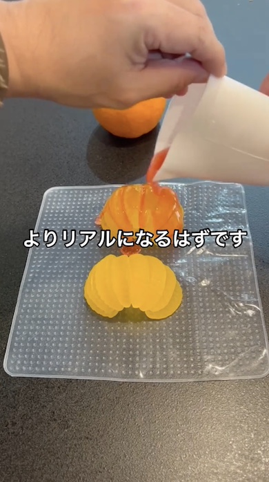 取り出したのは、先ほどのみかんグミよりもやや色の濃い、赤みがかったみかんグミ。これを加熱して溶かし、先ほど組み上げた立体みかんグミの上に流しかけます。こ、これは……みかんの皮だ!