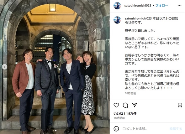 佐藤さんは、「息子が入籍しました。家族思いで優しくて、ちょっぴり頑固なところがあるけれど、私にはもったいない息子です」とわが子への愛情をのぞかせながら慶事を報告。