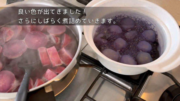 マモノエキスの代わりは、大量の紫芋。皮ごと煮こむことで、あの紫色を出す算段です。