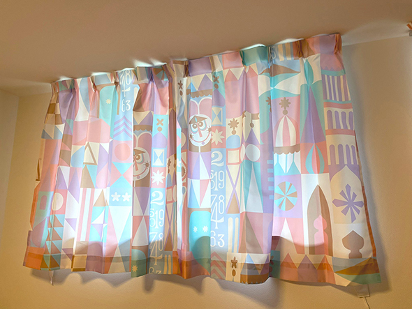 グリーンやピンクといったカラフルな色がたくさん使われたカーテンは、一見幾何学柄のようにも見えますが……。実はこれ、東京ディズニーランドのアトラクション「イッツ・ア・スモールワールド」の外観を模した柄になっているのです! 積み木のような建物や時計がデフォルメされたキュートな柄は、ディズニー好きにはたまりません。