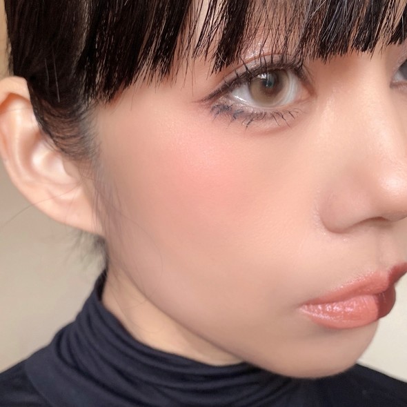 かわいい系メイクは、全体的に柔らかくキュートな仕上がり。目元は束感のあるまつ毛に、タレ目気味に引かれたアイライン、そしてぷっくり膨らんだ涙袋が印象的です。頬にはピンク系のチークをフワッと広めに入れ、リップも同系色のものをチョイスしています。