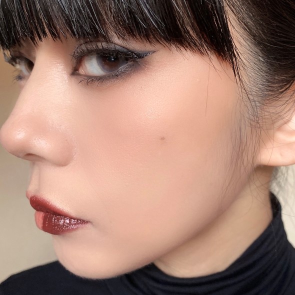 目元には暗い色味のアイシャドウを選びました。アイラインは先ほどよりも長めにキュッと引き、大人っぽい雰囲気に。リップは深みのあるレッドカラーでこちらもよくお似合いです。