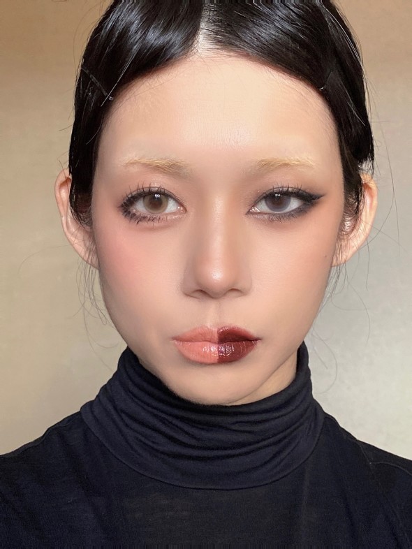 続いてもう半分を見てみると、ガラッと印象が変化。シェーディングやチークの入れ方を変えているそうで、鼻筋はスッと通り、輪郭もシャープになっています。チークカラーもピンクからブラウンにチェンジ。こちらは頬骨に沿って斜めにのせています。