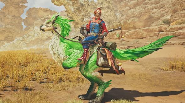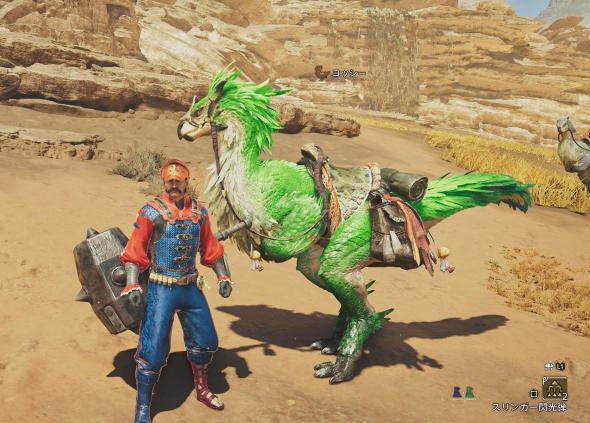 荒野に現れたのは、赤と青の服を着てハンマーを持ったおじさんと緑色のセクレト(騎乗可能な鳥竜種のような味方モンスター)。キノコを食べて大きくなったり「!」ブロックをたたいていたりしそうな雰囲気です。そんなことを考えながら見てみると、セクレトの上に「ヨッシー」って書いてある。言い逃れできねぇ!
