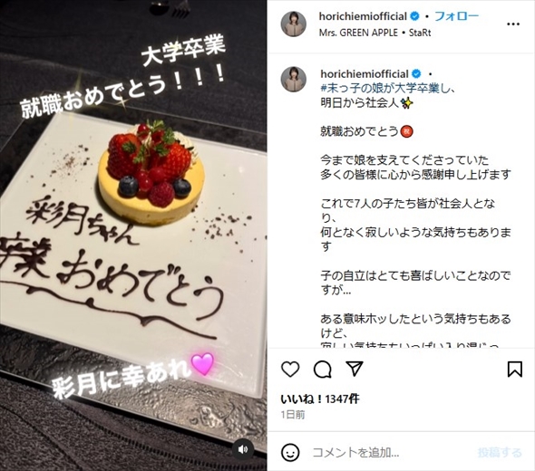 タレントの堀ちえみさんが4月1日にInstagramを更新。末娘・彩月さんの大学卒業&就職を報告し、「7人の子たち皆が社会人となり、何となく寂しいような気持ちもあります」と親心をつづっています。