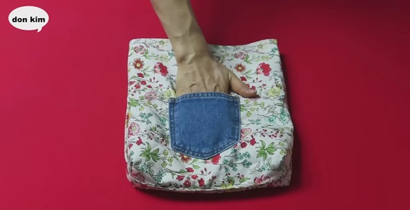 また、ジーンズについているポケットを2つ丁寧に切り離したら、花柄の生地に縫い付けておきます。最後にこれまで用意した生地をすべて縫い合わせたら、ユニークな2in1のバッグが完成しました!