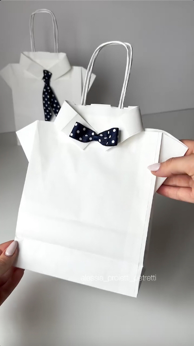 仕上げにリボンを切って、ネクタイのように貼り付ければ完成です。簡単でかわいいギフトバッグのアレンジ。父の日のプレゼントなどに使うと喜ばれそうですね。