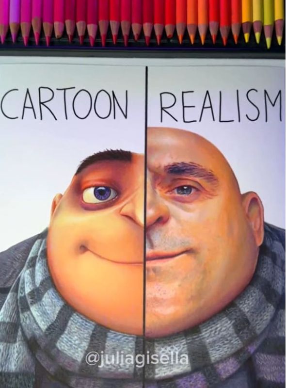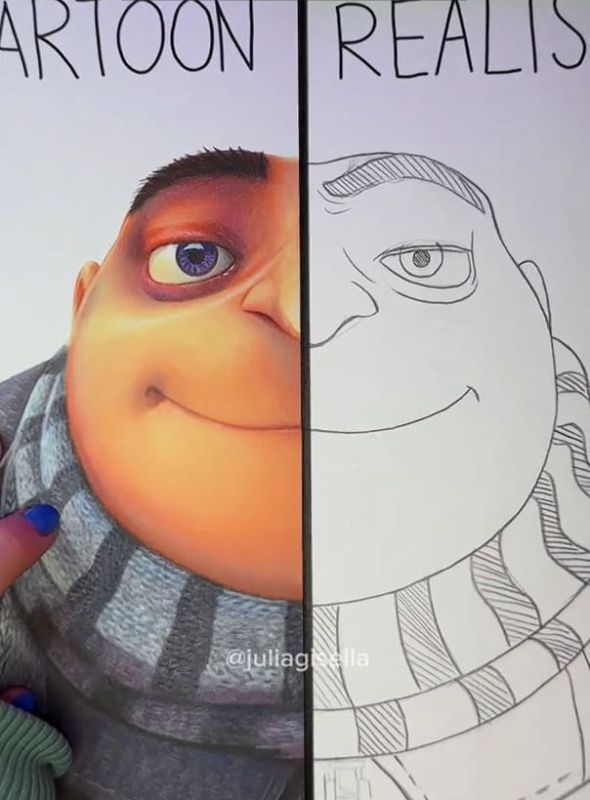 この話題を投稿したのは、フォロワー数1500万人を超える人気インフルエンサーjuliagisella(@juliagisella)さん。独自のアートスタイルで数々の“ビフォーアフター”作品を手掛けており、今回はアニメーション映画「怪盗グルー」シリーズの主人公であるグルーを、アニメ調と写実風の2つのテイストで描き分けています。