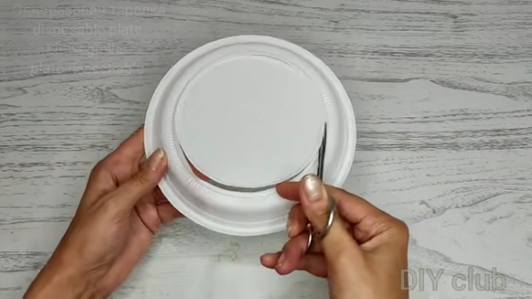 まずは、白い紙皿の底をハサミで丸くくり抜きます。裏返しにして黒い板に張り付け、中央部分に粘土と針金で土台を作ります。プラスチックボトルの底を切ったら土台のそばに埋め込み、液状の粘土を流し込みます。