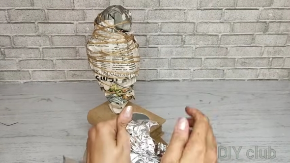 続いて、古い新聞紙を土台にくるくると巻きつけてフクロウの形を作ります。麻のひもを巻き付けて固定したら、上にアルミ箔を巻き付けて針金をさらに差し込みます。
