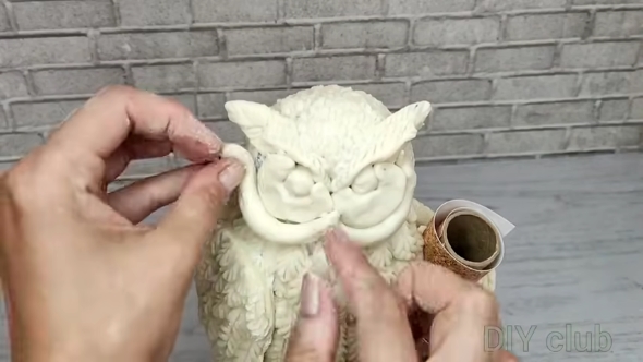 うろこ状に形成した白い粘土をアルミ箔の上から貼っていきます。細かい部分はヘラなどを使い描くこだわりようです。だんだんとペン立ての形が見えてきましたね。フクロウの顔は、くちばしや目などを丁寧に粘土で形成します。